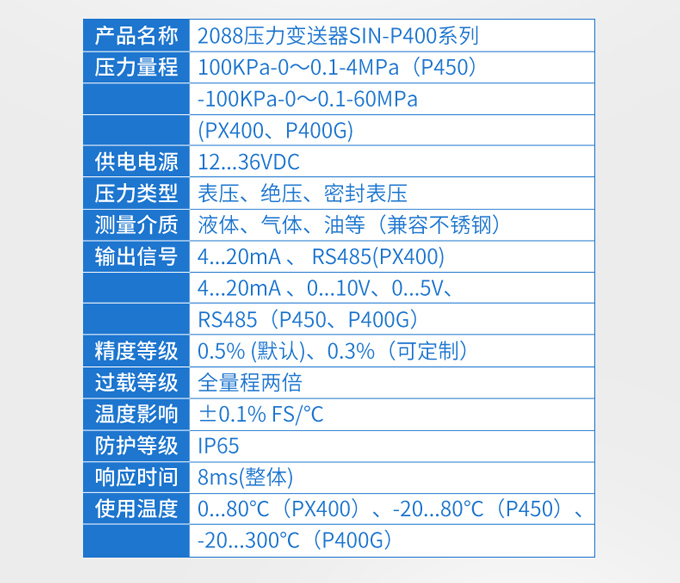 應用行業:SIN-P400的2088殼體防護壓力變送器廣泛應用于恒壓供水、液壓設備、消防水以及化工行業。